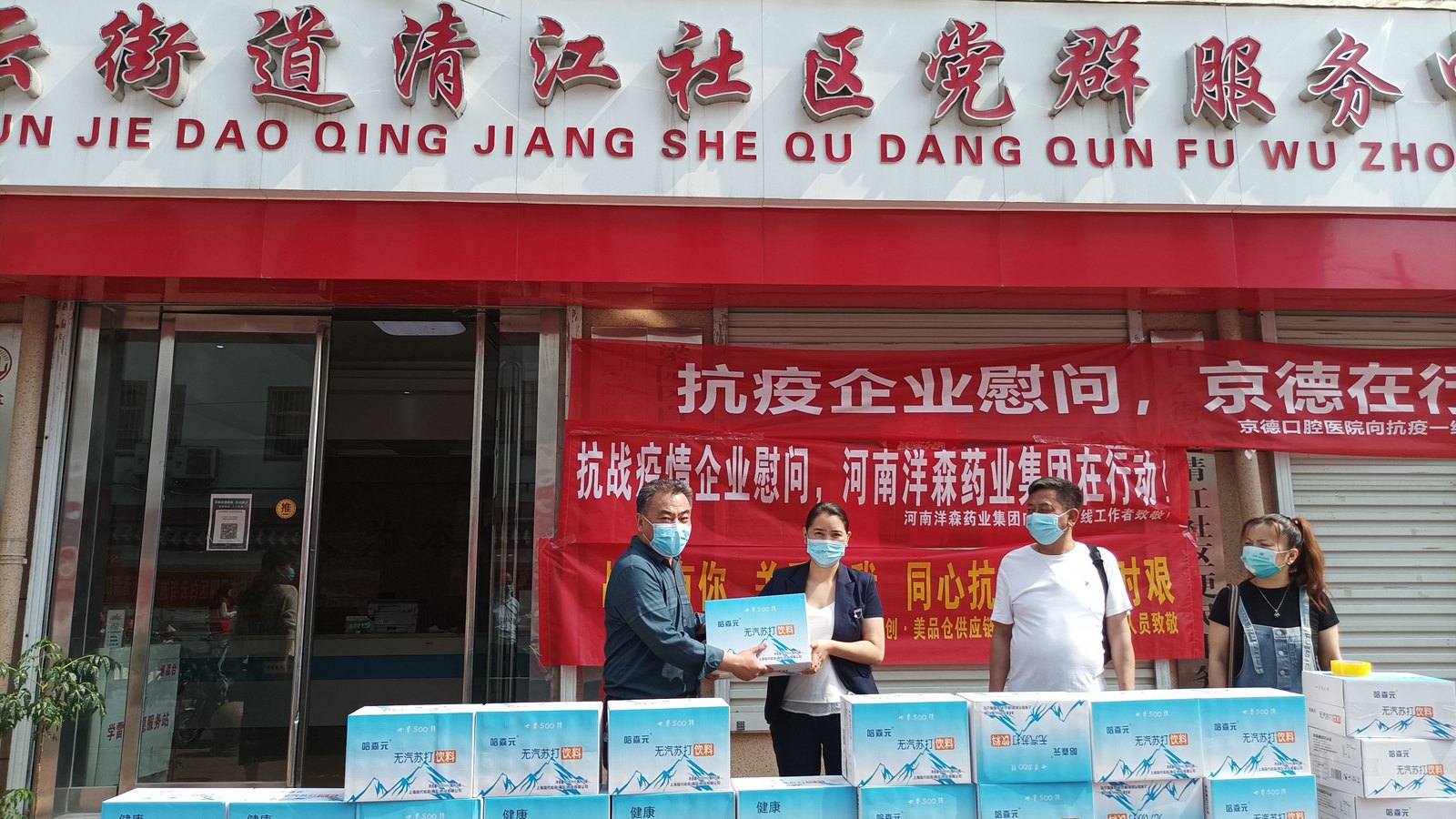 众志成城抗疫情,爱心企业显担当。河南洋森药业、京德牙科医院等爱心企业展现社会责任和担当,主动支援基层一线防疫工作,为清江社区和商电铝社区的志愿者们总计捐赠爱心苏打水100箱,以实际行动扛起助力疫情防控责任,诠释了新时代企业的担当与作为,为疫情防控工作尽一份绵薄之力。