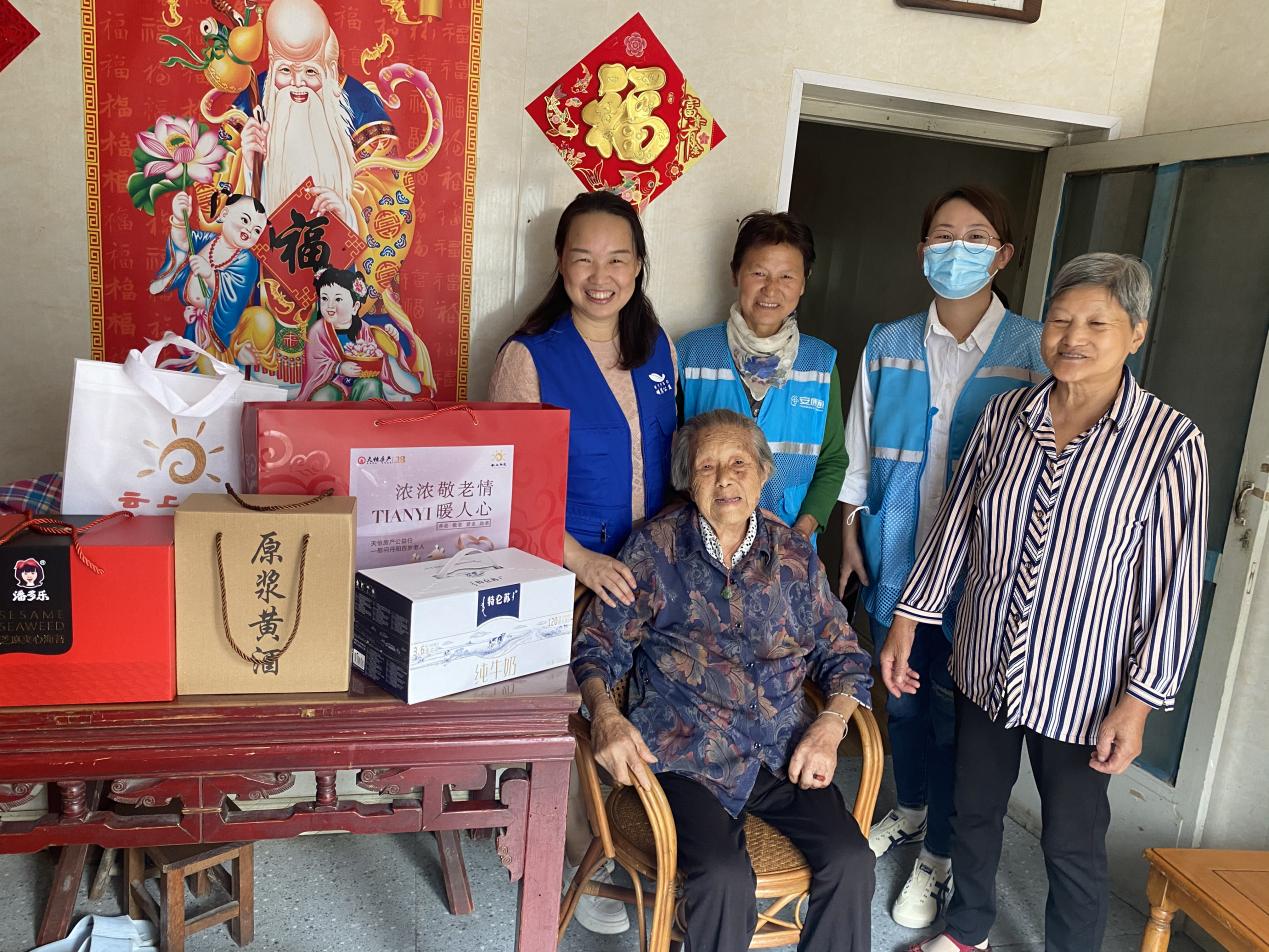 此次慰问行动,除了有爱心志愿者参与,此次捐赠慰问物资的爱心企业天怡房产也积极发动公司员工参与慰问。9月29日一早,在云上阳光基金会集中领取物资,了解慰问注意事项后,便分组出发前往慰问。天怡的志愿者与百岁老人亲切交流着近况,今年102岁的老人韩芝英感动的留下眼泪,感谢着前来慰问的志愿者们,简单的话语却透露出老人对于社会关注的深深动容。
