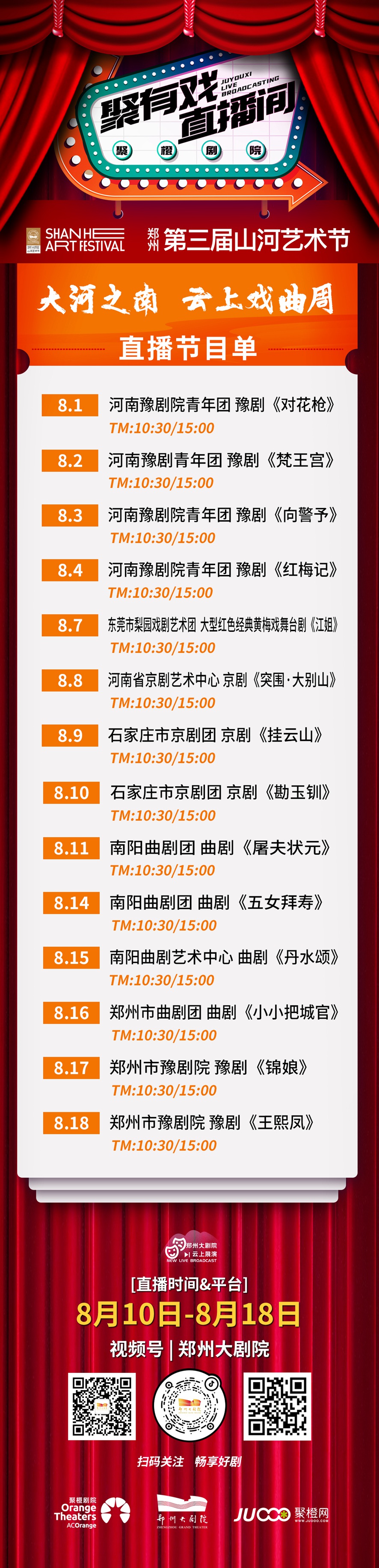 郑州第三届山河艺术节推出“大河之南,云上戏曲周 ”线上展演。8月1日至8月14日,14台28场经典曲目,包含豫剧、曲剧、京剧、黄梅戏等多品类剧种将在郑州大剧院视频号播出,《突围·大别山》《丹水颂》等剧目,以河南为故事背景,突出河南元素。