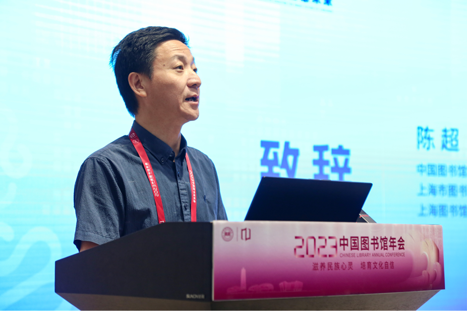 中国图书馆学会副理事长、上海市图书馆学会理事长、上海图书馆(上海科学技术情报研究所)馆(所)长陈超致辞