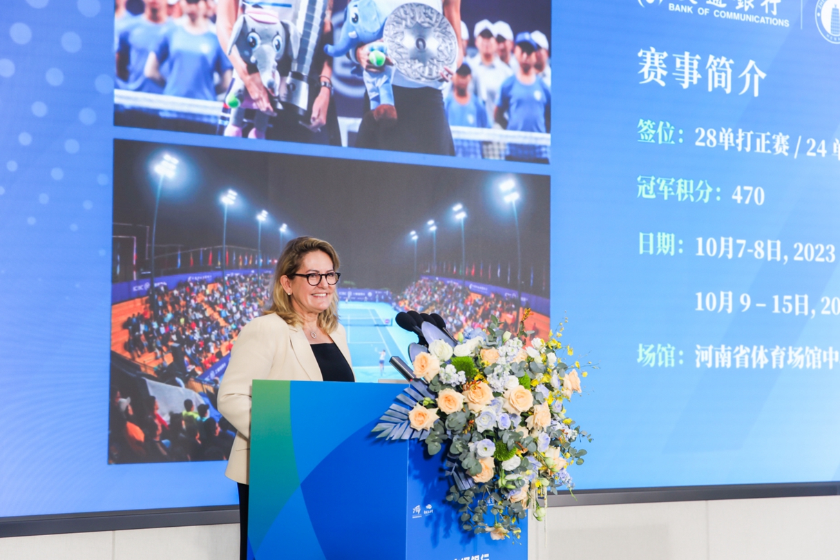 9月22日,2023交通银行郑州网球公开赛新闻发布会在中原科技城投资促进中心举行。赛事总监Laura Ceccarelli(劳拉·齐卡莱丽),河南省体育局副局长田间,郑州市人民政府副市长陈红民等嘉宾出席会议。