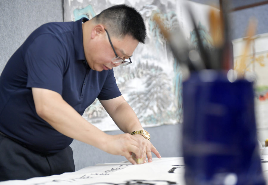 工作室里,一位书法家铺开长长画案上的宣纸,提笔饱蘸浓墨,挥毫间,遒劲有力、清雅古朴的书法跃然纸上,署名盖章一气呵成,令人不由大为赞叹,这位书法家正是史宝银。