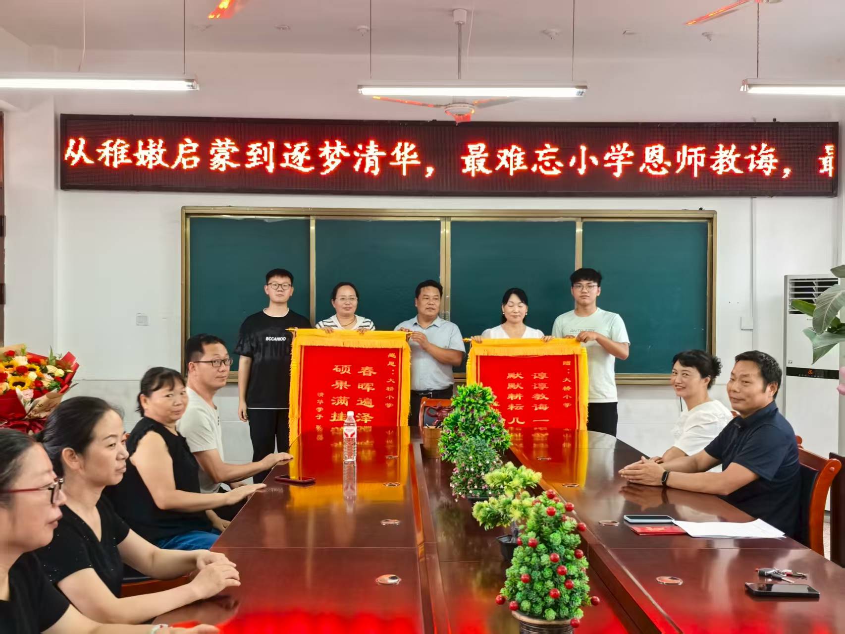 (通讯员:张玉锋 杨佳) 8月8日上午,西峡县五里桥镇大桥小学校园里洋溢着温馨与喜悦。该校两位优秀毕业生张志彬、喻昊辰同学,在成功考入清北大学后,满怀感恩之心重返母校,向曾经培育他的老师们赠送锦旗与鲜花,以此表达对母校和老师的感激之情。