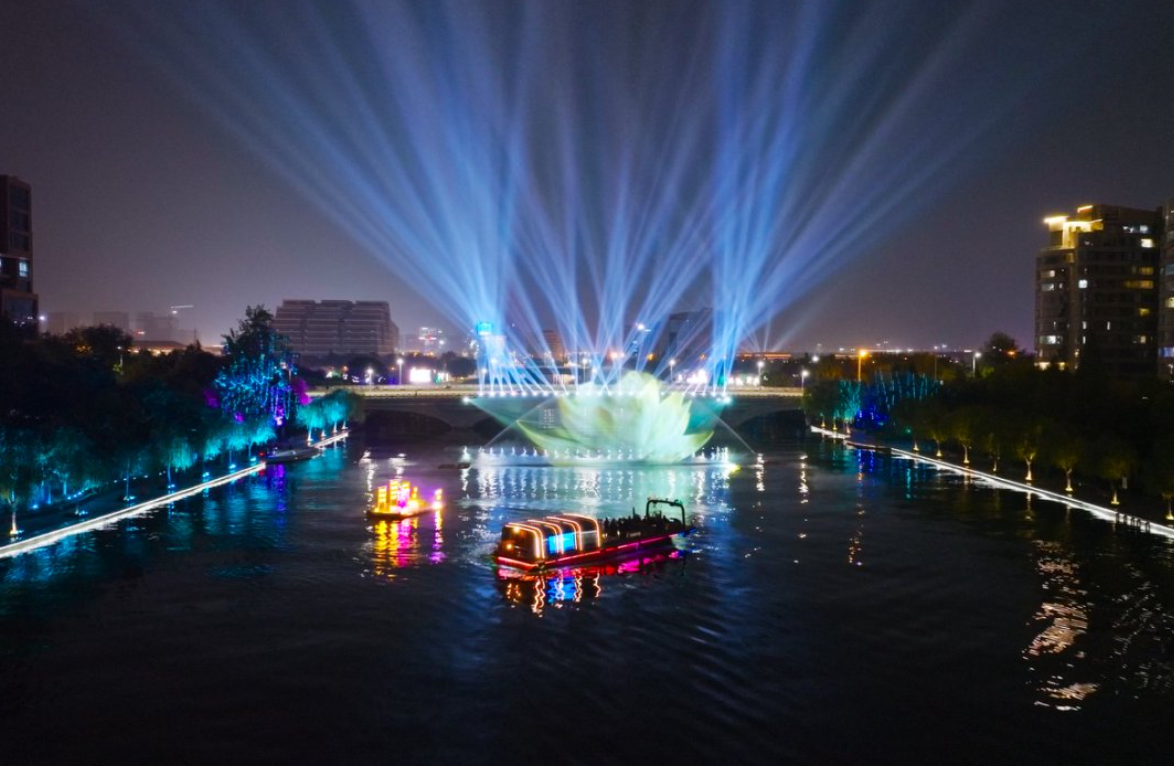 活动伊始,水上沉浸式演出《船说郑州》为大家串起一条水上时间之路。从黄帝的厚德雄浑到商都的千年根脉,从唐诗宋词的极致浪漫到嵩山武韵的创新演绎……演出以天地为幕,湖水为台,通过“天地之中、黄帝故里、功夫郑州、大河奔涌、寰宇同辉”五幕核心场景以及灯光秀、水幕投影和伴船演艺,将城市风貌与历史文化转化为可感、可及的沉浸式视听盛宴,在5.2公里的航程中讲述出河南的千年文化精粹。