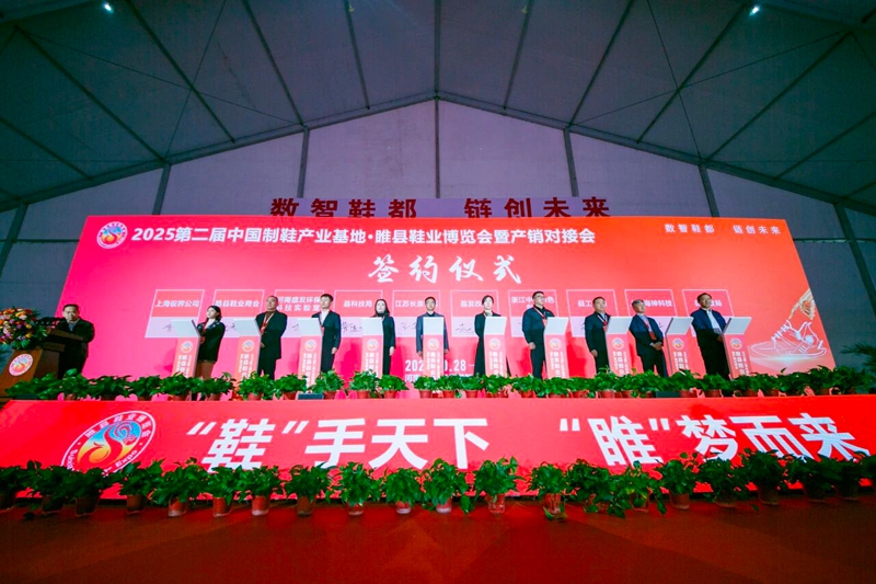 开幕式上,商丘市委常委、组织部部长毕启民宣布:“2025第二届中国制鞋产业基地睢县鞋业博览会暨产销对接会开幕!”睢县招商单位分别与晋江鞋纺城等客商签约涉及制鞋、鞋材配套、智能制造等领域的招商引资项目16个,总投资额达108.5亿元。同时,睢县启动了河南省皮革行业协会成立40周年庆典仪式。开幕式结束后,参会领导、嘉宾、客商和媒体记者分别开展展区巡视和采访活动。
