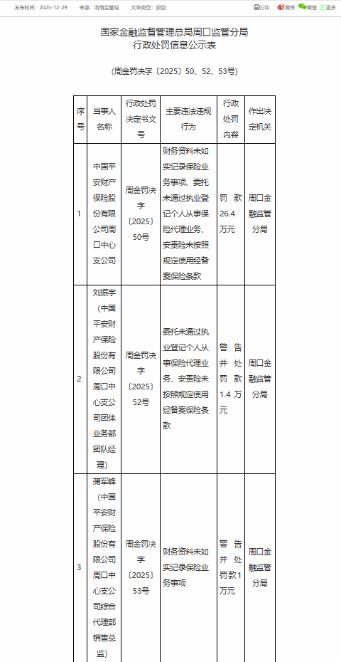 12月29日,国家金融监督管理总局周口金融监管分局发布了罚单,剑指中国平安财产保险股份有限公司周口中心支公司及其相关责任人。