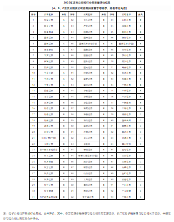 据悉,本次评价对象包括2024年1月1日至12月31日开展股票保荐、债券承销、并购重组财务顾问和全国股转公司(北交所)相关投行业务的93家证券公司,仅开展持续督导业务的证券公司未纳入评价范围。根据《证券公司投行业务质量评价办法(2025年修订),评价结果分为A、B、C三类,本次评价结果A类12家、B类66家、C类15家。其类别的划分主要反映参评证券公司股票保荐、债券承销、并购重组财务顾问和股转公司(北交所)等四类投行业务执业质量、内控制度建设与执行、服务高水平科技、支持上市公司并购重组及新股估值定价等情况的相对水平,不涉及对证券公司资信状况和业务资格的评价。