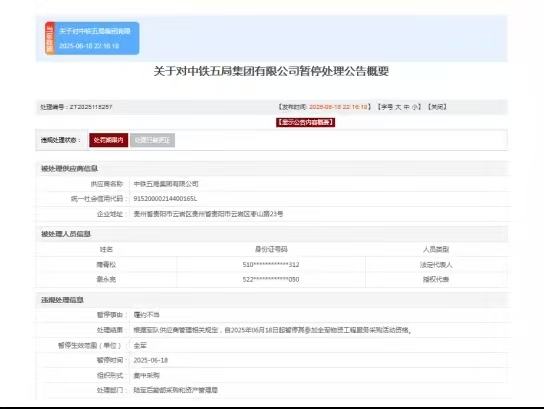 香港经济导报记者梳理发现,这次的停业整顿,并不是一个孤立的事件。早在2025年6月18日,陆军后勤部采购和资产管理局就已经发布过一个处理决定,暂停了中铁五局参加全军物资、工程、服务采购活动的资格。