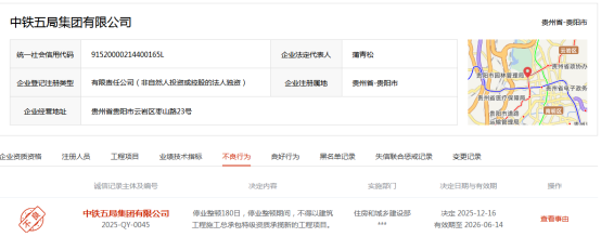 日前,全国建筑市场监管公共服务平台信息显示,中铁五局集团有限公司(以下简称“中铁五局”)被住房和城乡建设部实施停业整顿180日。决定时间为2025年12月16日,有效期至2026年6月14日。停业整顿期间,不得以建筑工程施工总承包特级资质承揽新的工程项目,涉及的具体事由未公开。