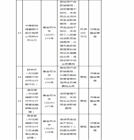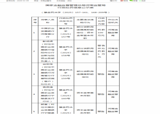 2026年伊始,国家金融监督管理总局河南监管局开出第一张行政处罚单,中国农业发展银行河南省分行、中国邮政储蓄银行河南多家分支行、中国银行股份有限公司河南省分行、中国信达资产管理股份有限公司河南省分公司等多家金融机构被罚。其中,因存在多项违法违规行为,中国邮政储蓄银行河南省分行及直属支行、郑州市分行合计被罚360万元,9名责任人被警告。