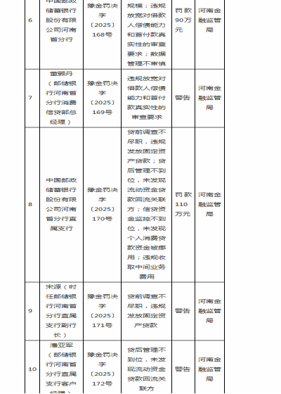 1月9日,国家金融监督管理总局河南监管局发布了《国家金融监督管理总局河南监管局行政处罚信息公示表》,该表显示,因存在多项违法违规行为,中国邮政储蓄银行河南省分行及直属支行、郑州市分行合计被罚360万元,9名责任人被警告。