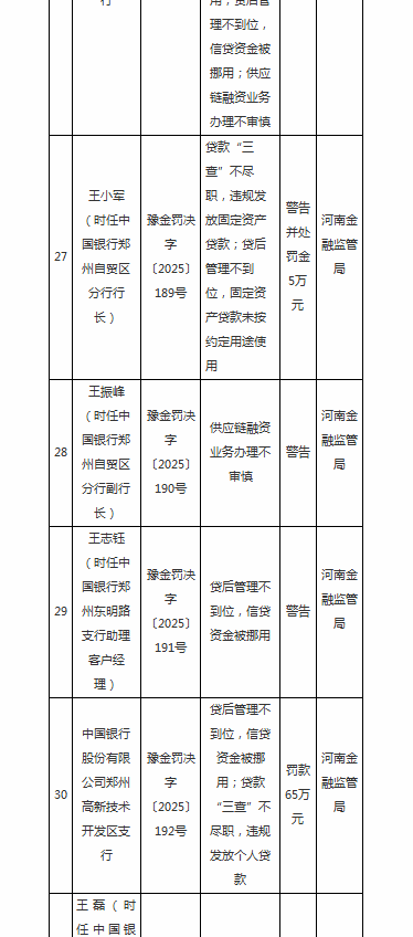 时任该行郑州自贸区分行行长王小军因贷款“三查”不尽职,违规发放固定资产贷款;贷后管理不到位,固定资产贷款未按约定用途使用,被警告并处罚金5万元。时任中国银行郑州自贸区分行副行长王振峰,因供应链融资业务办理不审慎;时任中国银行郑州东明路支行助理客户经理王志钰,因贷后管理不到位,信贷资金被挪用;二人均被予以警告。