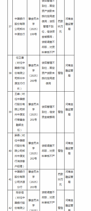 时任中国银行郑州中原支行行长任立谦,因贷后管理不到位,固定资产贷款未按约定用途使用;时任中国银行郑州中原支行普惠金融部主任王峰,因贷后管理不到位,信贷资金被挪用;时任中国银行郑州中原支行消贷客户经理麻森,因贷前调查不尽职,对资料审核不严;三人均被予以警告。