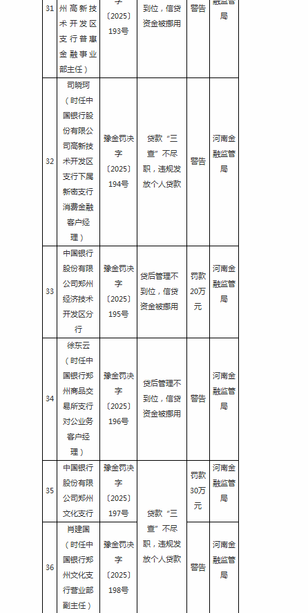 时任中国银行郑州高新技术开发区支行普惠金融事业部主任王磊,因贷后管理不到位,信贷资金被挪用;时任中国银行高新技术开发区支行下属新密支行消费金融客户经理司晓珂,因贷款“三查”不尽职,违规发放个人贷款;二人被予以警告。