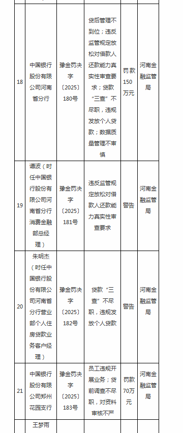 根据相关规定,河南金融监管局对其处罚款150万元。时任中国银行河南省分行消费金融部总经理谭波,因违反监管规定放松对借款人还款能力真实性审查要求;时任中国银行河南省分行营业部个人住房贷款业务客户经理朱明杰,因贷款“三查”不尽职,违规发放个人贷款;二人被予以警告。