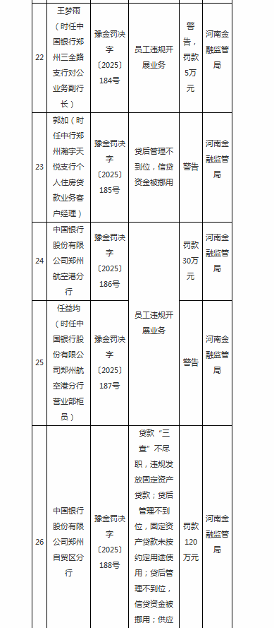 根据相关规定,河南金融监管局对其处罚款70万元。时任中国银行郑州三全路支行对公业务副行长王梦雨负有责任,被警告并罚款5万元。时任该行郑州瀚宇天悦支行个人住房贷款业务客户经理郭加负有责任被警告。