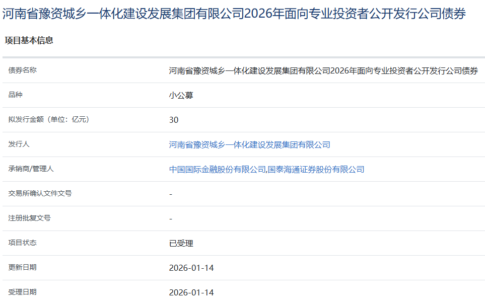 1月15日,河南省豫资城乡一体化建设发展集团有限公司2026年面向专业投资者公开发行公司债券项目,已获上交所受理。