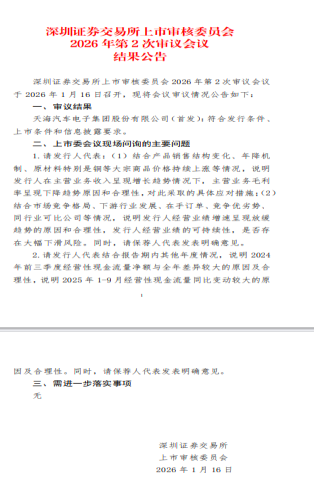 1月16日,深圳证券交易所上市审核委员会《2026年第2次审议会议结果公告》披露,天海汽车电子集团股份有限公司(以下简称:天海电子)首发事项符合发行条件、上市条件和信息披露要求。