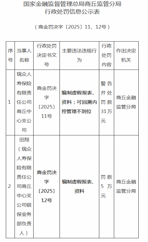 1月19日,国家金融监督管理总局商丘监管分局披露的行政处罚信息显示,瑞众人寿保险有限责任公司商丘中心支公司被警告并处罚款31万元,负责人被罚款5万元。