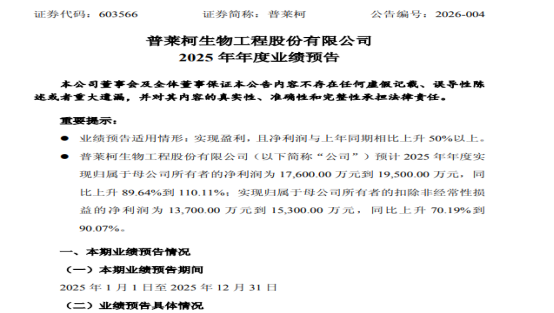 1月20日,普莱柯生物工程股份有限公司(证券简称:普莱柯 603566.SH)发布2025年年度业绩预告。