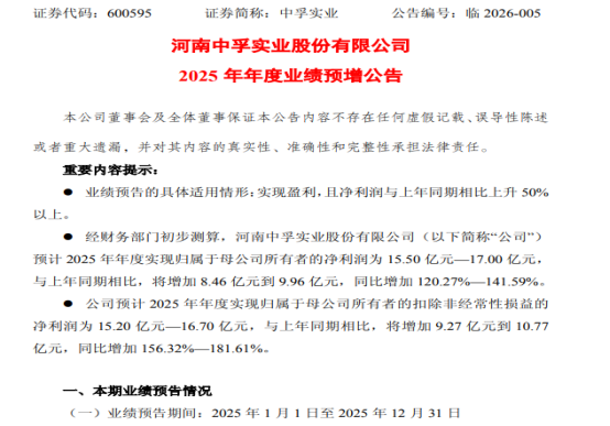 1月20日,河南中孚实业股份有限公司(股票简称:中孚实业 600595.SH)披露业绩预增公告。