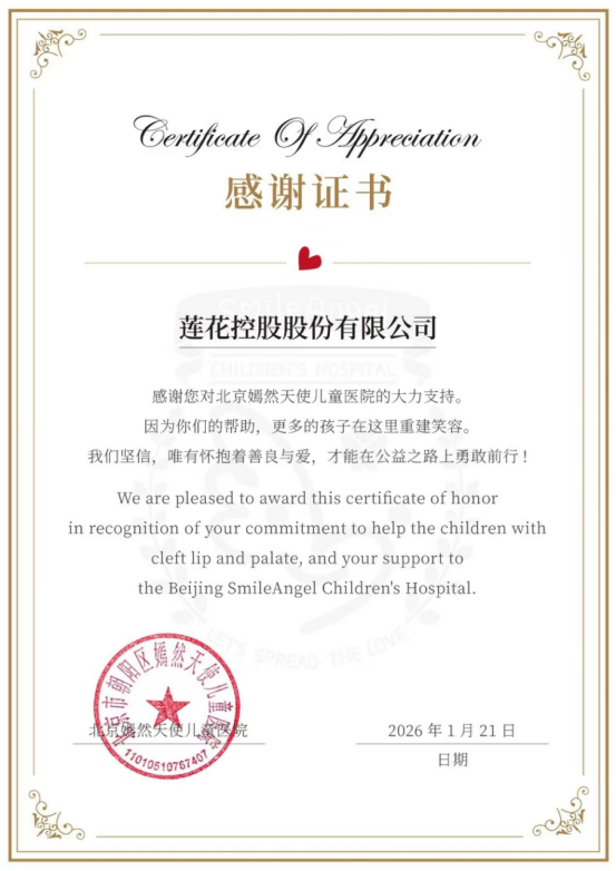 1月21日,莲花控股官方微信显示,该公司向面临运营困境的北京市朝阳区嫣然天使儿童医院定向捐赠善款52万元,该笔善款将专项用于唇腭裂儿童的医疗救助与康复支持工作,以帮助更多贫困家庭儿童获得专业诊疗服务。