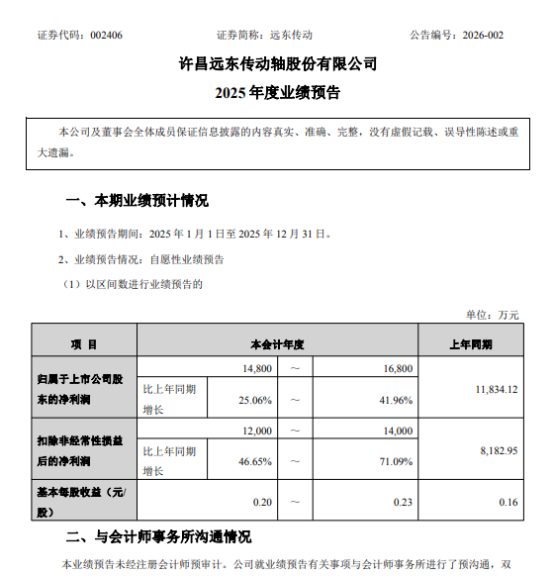 1月20日,许昌远东传动轴股份有限公司(证券简称:远东传动 002406.SZ)披露2025年度业绩预告,预计2025年实现归属于上市公司股东的净利润1.48亿元至1.68亿元,同比增长25.06%至41.96%;扣除非经常性损益后的净利润1.2亿元至1.4亿元,同比增长46.65%至71.09%。