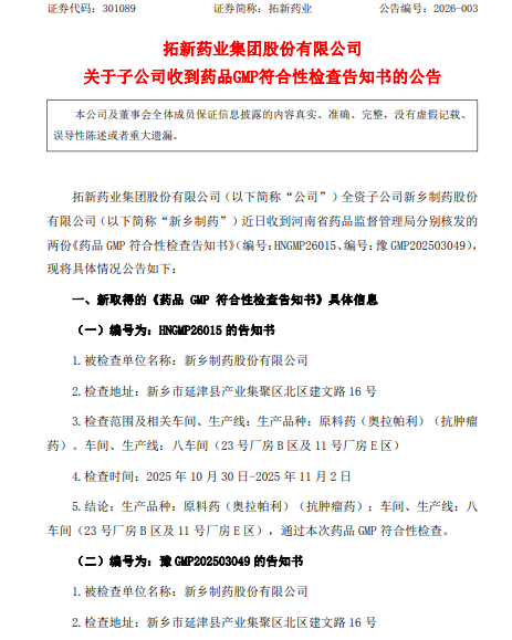 1月20日,拓新药业集团股份有限公司(证券简称:拓新药业 301089.SZ)发布公告,全资子公司新乡制药股份有限公司(以下简称:新乡制药)近日收到河南省药品监督管理局核发的两份《药品GMP符合性检查告知书》。