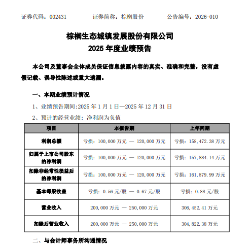 1月23日,棕榈生态城镇发展股份有限公司(证券简称:棕榈股份 002431.SZ)披露2025年度业绩预告。2025年,棕榈股份营业收入为20亿元至25亿元;归属于上市公司股东的亏损为10亿元至12亿元,上年同期亏损15.78亿元;扣除非经常性损益后的净利润为亏损10亿元 至12亿元,上年同期亏损16.19 亿元,比2024年同期,亏损有所收窄。