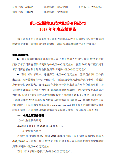 业绩预告称,经财务部门初步测算,航天宏图预计2025年度归母净利润为-10.3亿元左右;预计扣非后归母净利润为-10.8亿元左右;预计2025年期末净资产为-2.8亿元左右。