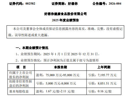2025年,好想你预计归属于上市公司股东的净利润为7.5亿元至9.5亿元,扣除非经常性损益后的净利润为亏损5000万元至8000万元,基本每股收益为1.67 元到2.11 元。去年同期,归属于上市公司股东的净利润为亏损7195.77 万元,扣除非经常性损益后的净利润为亏损8051.51 万元,每股亏损0.16 元。