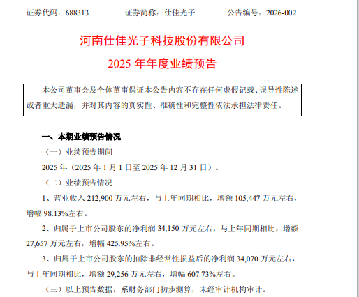 1月28日,仕佳光子发布2025年年度业绩预告,业绩预喜,营业收入几近翻倍,净利润增幅 425.95%左右,扣非后的净利润增幅预计达到600%以上。