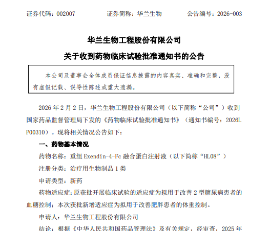 公告称,药物名称为重组Exendin-4-Fc融合蛋白注射液(HL08),注册分类为治疗用生物制品1类,申请类型为新药。原获批开展临床试验的适应症为拟用于改善2 型糖尿病患者的血糖控制;本次获批新增适应症为拟用于改善肥胖患者的体重控制。根据《中华人民共和国药品管理法》及有关规定,经审查,2025年11月27日该局受理的 HL08 临床试验申请符合药品注册的有关要求,同意本品在成人肥胖或超重患者中开展临床试验。