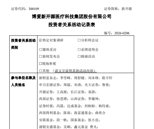 【香港经济导报网讯】2月9日,博爱新开源医疗科技集团股份有限公司发布(证券简称:新开源 300109.SZ)投资者关系活动记录表。