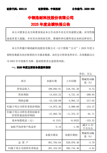 【香港经济导报网讯】2月25日,中钢洛耐科技股份有限公司(证券简称:中钢洛耐 688119.SH)发布业绩快报,2025年度实现营业总收入19.97亿元,同比下降8.72%;归属于母公司所有者的净利润-1.50亿元,同比下降153.37%;扣除非经常性损益的净利润-2.18亿元,同比下降91.71%。