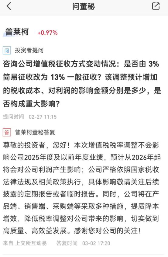 【香港经济导报网讯】“公司增值税征收方式是否将由3%简易征收调整为13%一般征收?该调整预计增加的税收成本、对利润的影响金额分别是多少,是否构成重大影响?”近日,有投资者在“上证e互动”平台向普莱柯生物工程股份有限公司(证券简称:普莱柯603566.SH)提问 。