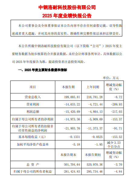 然而,就在这一技术突破消息发布的同时,中钢洛耐自身的经营“炉火”却显得火力不足。根据公司2026年2月26日发布的2025年度业绩快报,经初步核算,公司2025年实现营业总收入19.97亿元,同比下降8.72%;归属于母公司所有者的净利润为-1.50亿元,上年同期为-5909.69万元,亏损幅度扩大153.37%。