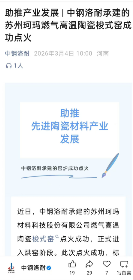 中钢洛耐表示,此次成功点火是双方15年合作的又一缩影,也为先进陶瓷产业上下游协同发展树立了典范。