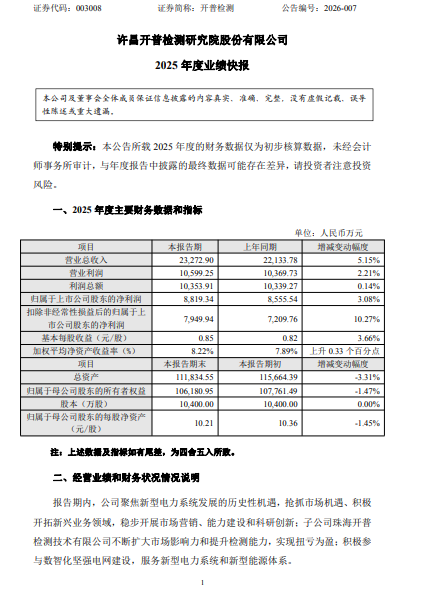 【香港经济导报网讯】3月16日,许昌开普检测研究院股份有限公司(证券简称:开普检测 003008.SZ)发布业绩快报,2025年度实现营业总收入2.33亿元,归属于上市公司股东的净利润突破8800万元,以此计算,公司净利率高达37.77%,第四季度实现净利润约3034.73万元,净利率达到43.4%,净利润较第三季度环比大增77.93%。