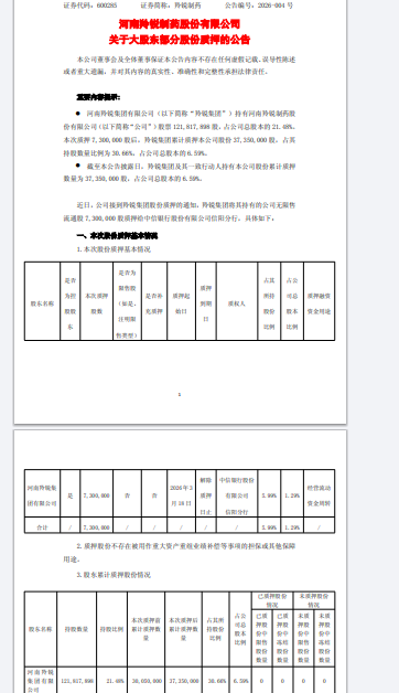 【香港经济导报网讯】3月20日,河南羚锐制药股份有限公司(证券简称:羚锐制药 600285.SH)披露,控股股东河南羚锐集团有限公司将所持730万股公司股份质押给中信银行股份有限公司信阳分行,占其持股比例的5.99%,占公司总股本的1.29%。这笔质押融资将用于经营流动资金周转。