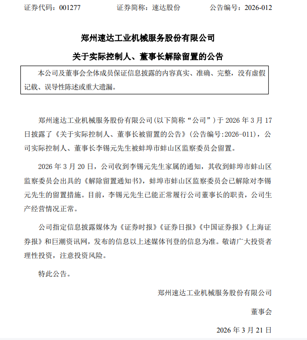 【香港经济导报网讯】3月20日晚间,郑州速达工业机械服务股份有限公司(证券简称:速达股份 001277.SZ)发布公告披露,公司当日收到李锡元家属通知,其收到蚌埠市蚌山区监察委员会出具的《解除留置通知书》,李锡元留置措施已被解除。目前,李锡元已能正常履行公司董事长职责,公司生产经营情况正常。