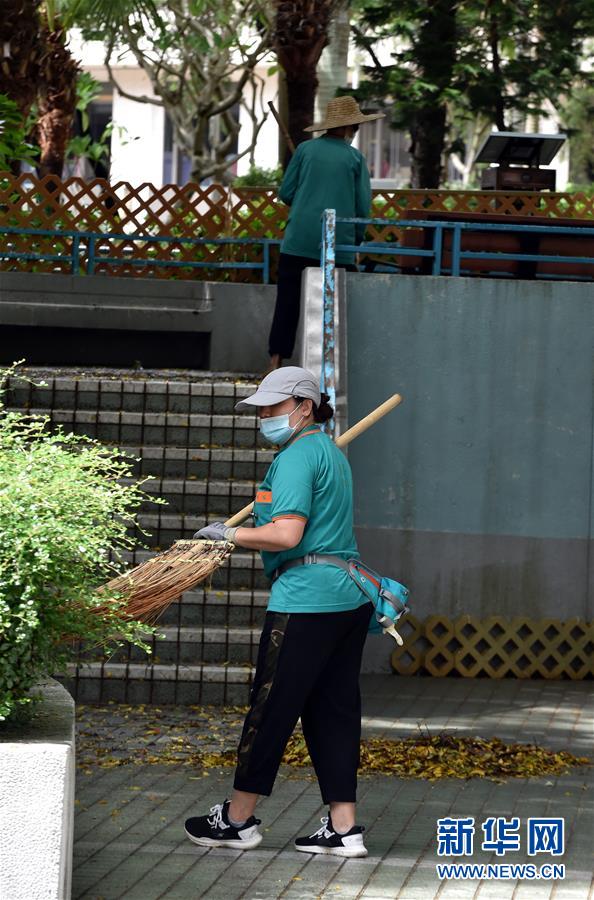 8月1日,工人在香港一公园内清理落叶。 新华社记者 卢炳辉 摄