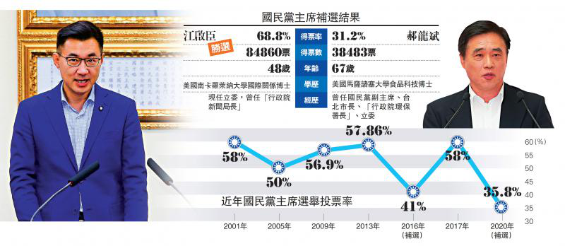 (中国国民党3月7日补选新任党主席,来自台中市的48岁“立委”江启臣胜选,击败67岁前党副主席郝龙斌,成为国民党最年轻党魁,也是首位身兼“立委”的党主席。)