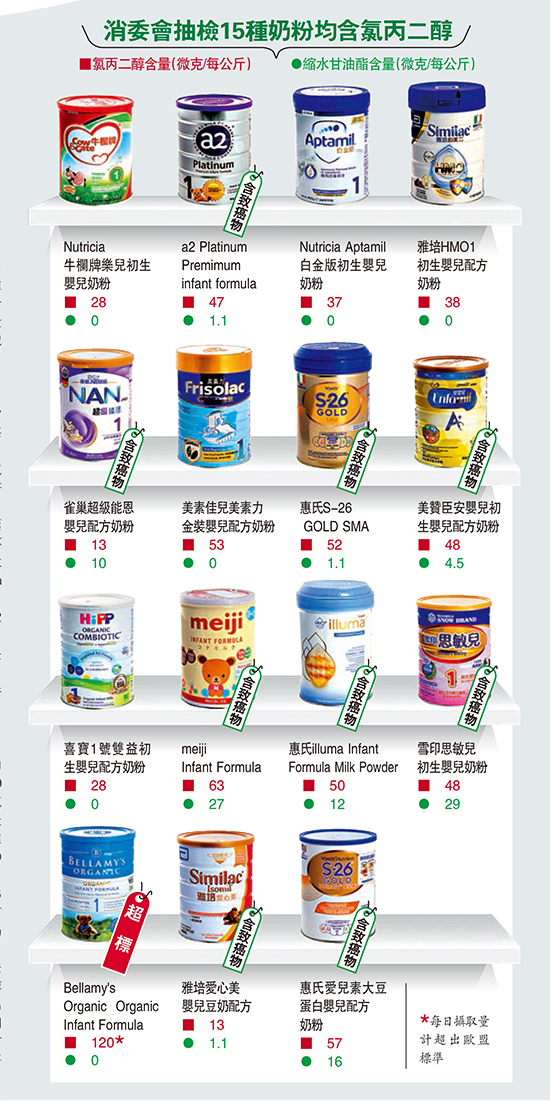 消委会所测试的15个样本中,全数均含有氯丙二醇,最少的样本每公斤含有13微克,最多则有120微克。最多的一个样本为澳洲的Bellamy's Organic奶粉。消委会推算,一名一个月大、体重4.3公斤的婴儿每天进食六餐奶计算,这个牌子的奶粉会超过欧洲食物安全局的建议摄入量。样本中含最少氯丙二醇的样本为雅培爱心美婴儿豆奶配方,每公斤仅13微克。