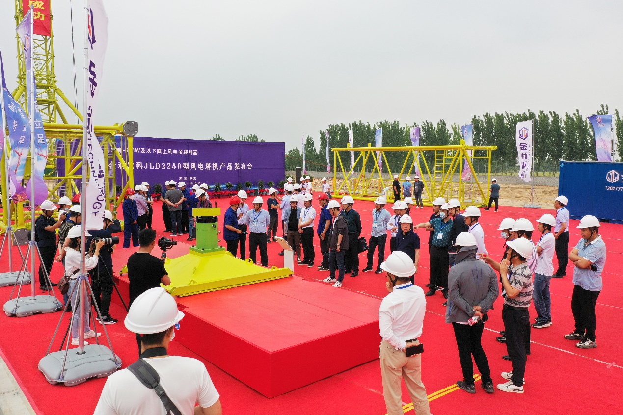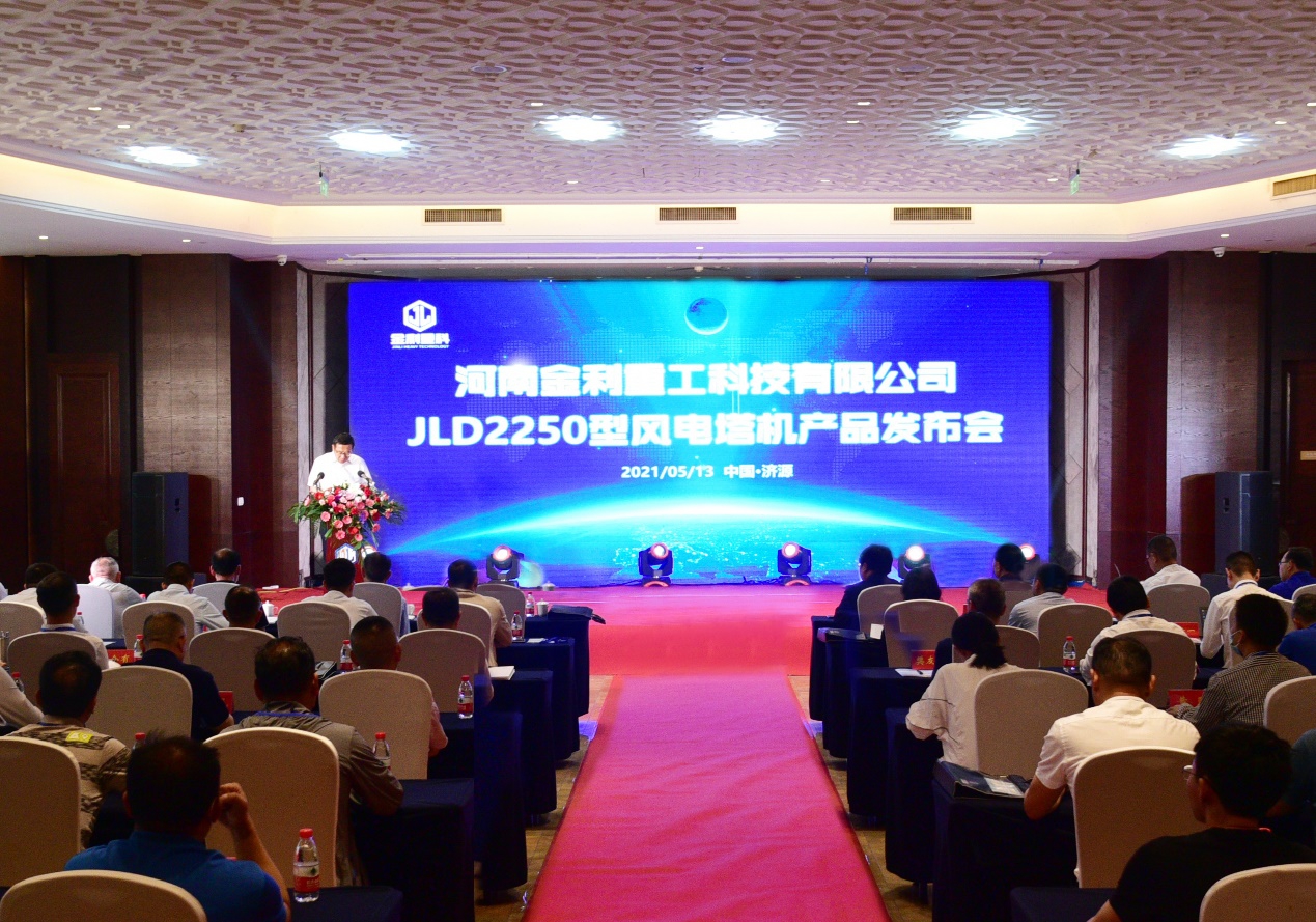 此次发布会的主题为“御风者-6MW及以下陆上风电吊装利器”,河南金利金铅集团有限公司党委书记、董事长成全明,党委副书记王万富,河南金利重工科技有限公司总经理宋广等公司领导出席了本次发布会,并为全新开发的JLD2250型风电塔机产品揭幕。