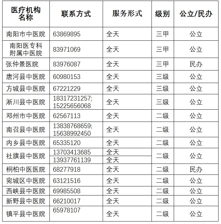 南阳市二三级中医医疗机构儿科医疗服务信息公示表
