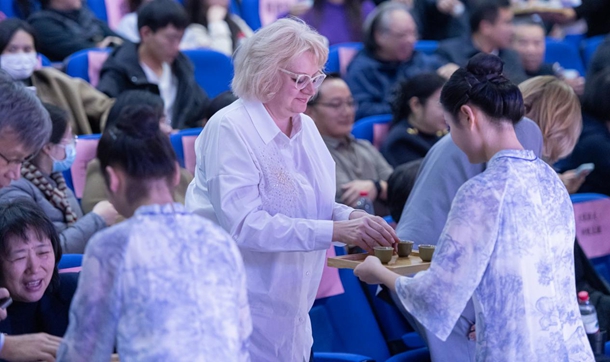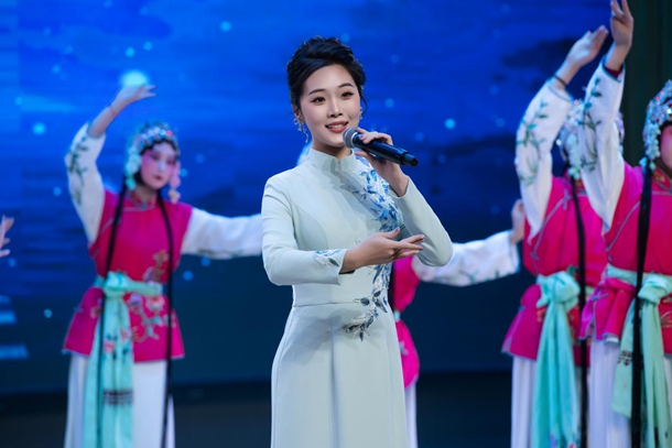 舞蹈学院师生以一曲《青花瓷》,将古典意象与民族舞韵完美融合,仿佛在清雅韵律中徐徐铺开一幅水墨丹青,勾勒出“天青色等烟雨”的唯美意境;传媒学院的茶艺展演通过沉浸式舞台呈现,让观众在氤氲茶香中感受中国传统文化之美;戏曲学院带来的戏歌《相思谣》将豫剧唱腔与现代流行元素相融合,展现出传统艺术的时代生命;外籍教师深情演绎经典歌曲《雪绒花》,优美的旋律如同跨越山海的文化纽带,在简单音符中传递出纯粹而温暖的情感共鸣;音乐学院与传媒学院共同演绎的《不要怕太阳下山有月光》则用温暖的和声传递出跨越文化的情感共鸣。整场演出在师生共同唱响的《明天会更好》中达到高潮,用艺术的语言奏响人类命运共同体的和谐乐章,现场掌声经久不息,热烈而真挚。