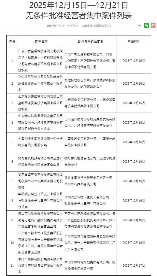 12月26日,市场监管总局发布2025年12月15日—12月21日无条件批准经营者集中案件列表,其中包括中国平煤神马控股集团收购河南能源集团股权案,审结时间为2025年12月17日。