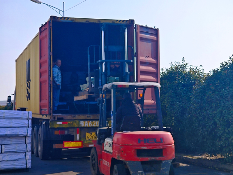 图为洛阳五羊三轮摩托车有限公司厂区内即将出口非洲的待组装零件正在装车。