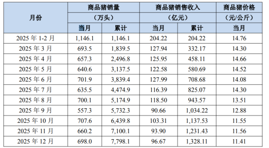 简报显示,2025年12月份,牧原股份销售商品猪698.0万头,同比变动-14.75%,其中向全资子公司牧原肉食品有限公司及其子公司合计销售商品猪339.0万头;商品猪销售收入96.67亿元,同比变动-36.06%。商品猪销售均价11.41元/公斤,同比变动-25.38%。